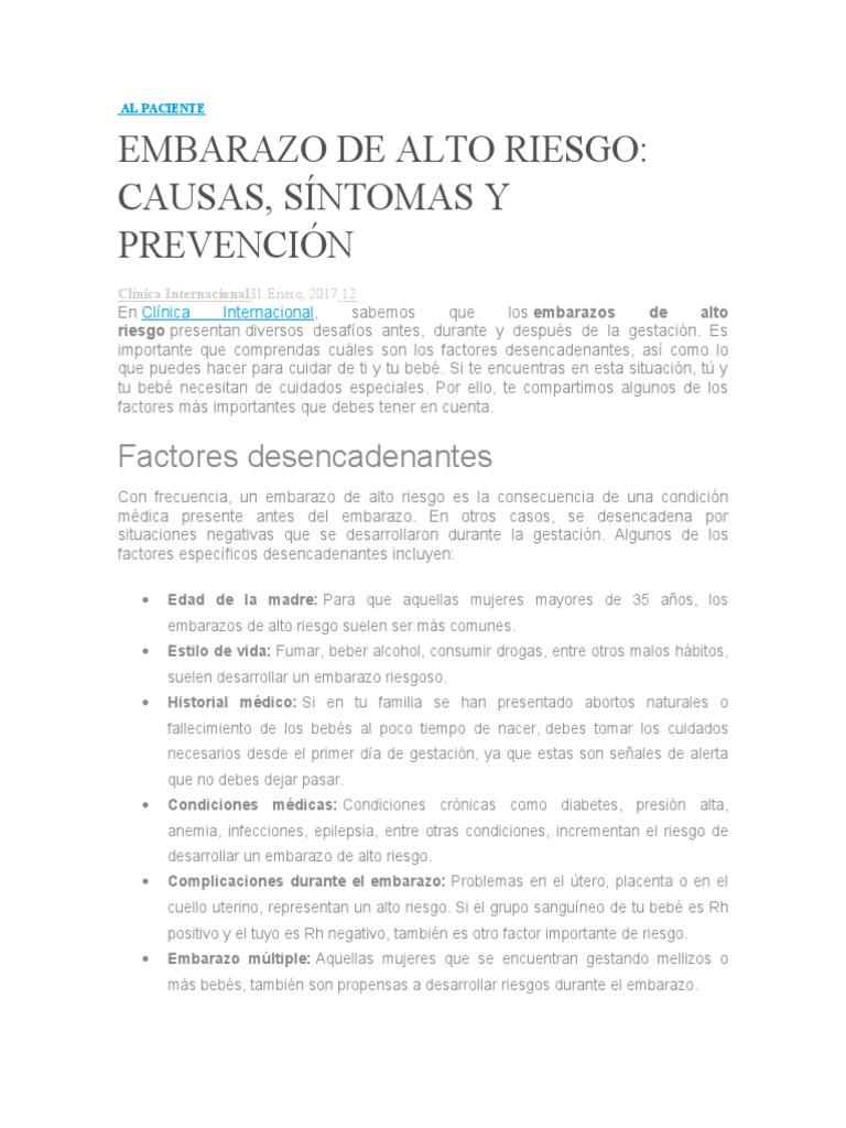 Aquí tienes algunos consejos sobre los cuidados a seguir por una embarazada en una gestación de alto riesgo. Embarazo de alto riesgo cuidados enfermeros factor de riesgo materno pre-eclampsia- eclampsia diabetes gestacional edad maternal. Un embarazo de alto riesgo es un embarazo que pone en riesgo la salud o la vida de la madre o del feto.